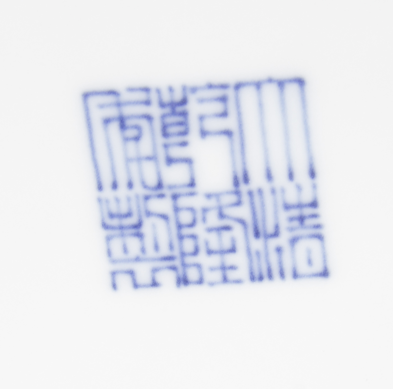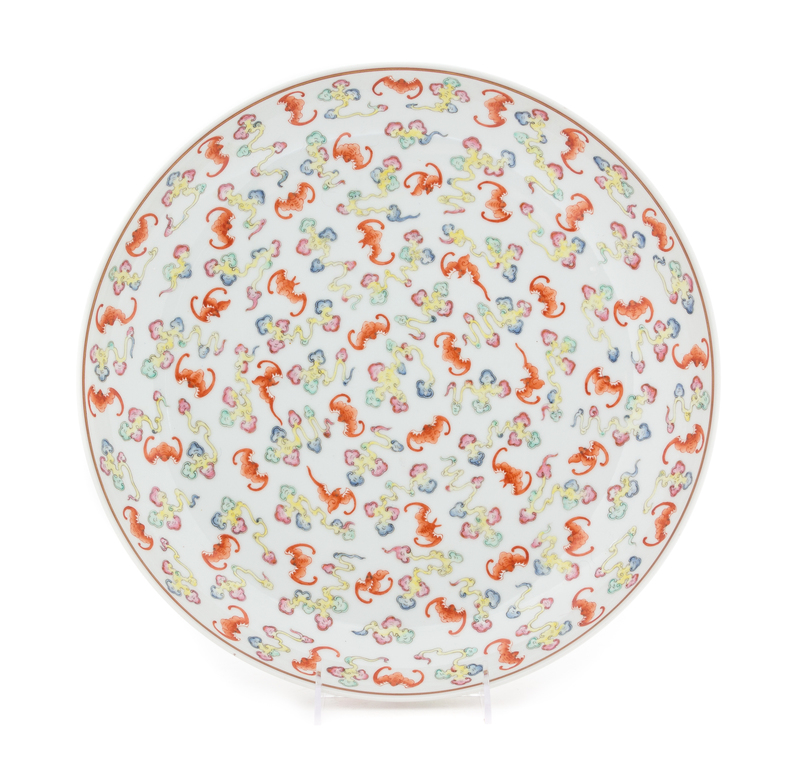 of circular form, decorated overall with flying bats in iron red amongst multi-color ruyi clouds, similar decoration extending to the exterior, the underside bearing an apocryphal Qianlong six-character mark in underglaze blue.