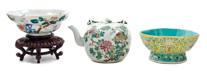 the first a teapot decorated with flowers and pear branches surmounted by two metal handles and a peach finial, the underside bearing a Hongxian four-character mark in iron red, the second a stepped bowl depicting birds in a rocky landscape, the underside bearing a Daoguang six-character iron red mark, raised on a carved hardwood stand, the third a hexagonal lobed bowl decorated with foliate and floriated motifs and shou characters, the underside bearing a Jiaqing six-character iron red mark.
