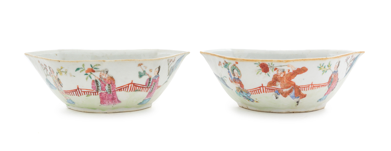 each of flared semicircular form with an everted rim, painted depicting three immortals in an outdoor scene, with three bats painted on the reverse.
