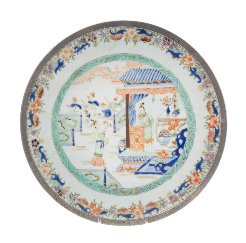 the central medallion depicting two court ladies in a garden pavilion, surrounded by a border of flowers and gourds, raised on metal mountings and three feet.