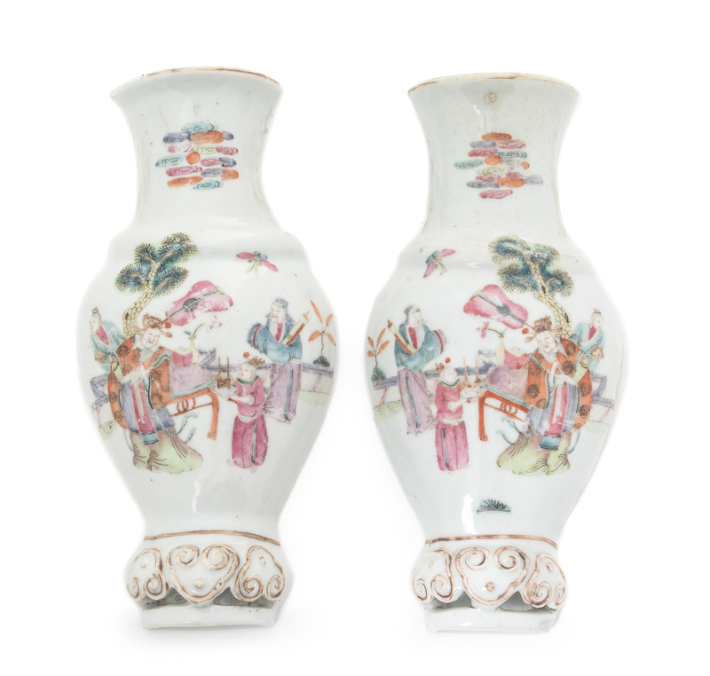 each painted to the front showing a scholar and his attendants presenting gifts to an official, set in an outdoor scene, above three carved ruyi heads to the foot.