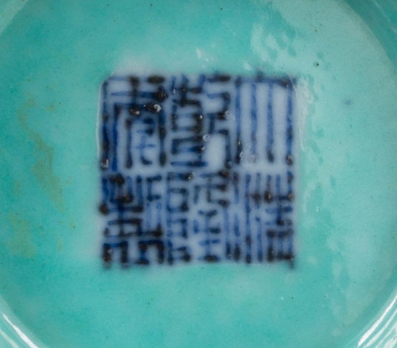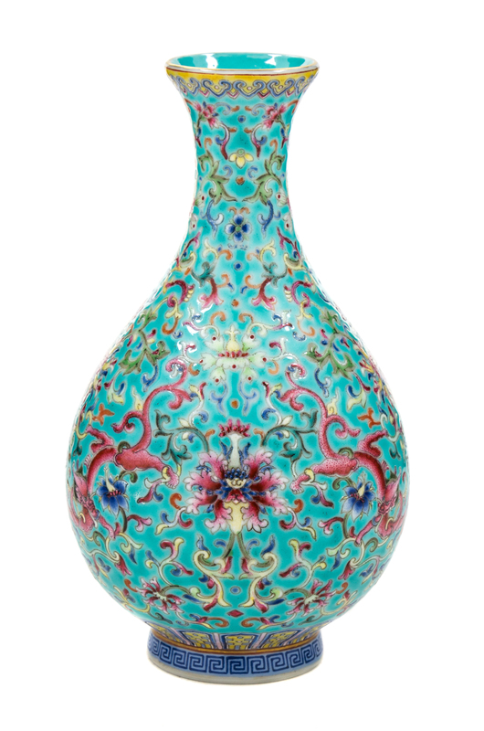 of yuhuchunping form, painted overall with scrolling lotus sprays interspersed with two pairs of sinuous chilongs clutching the tendrils, all reserved on a turquoise ground, between a band of ruyi heads to the mouth and a circle of lappet leaves to the foot, the underside glazed turquoise and bearing an apocryphal Qianlong six-character mark in underglaze blue.