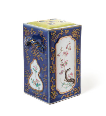 A Famille Rose and Gilt Decorated Powder Blue Porcelain Brush Holder, Bitong