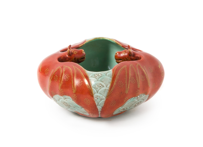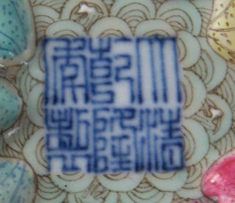 of quadrilateral form, depicting two bats with wings outstretched over a ground of waves, raised on a base of three polychrome bats, the underside bearing a Qianlong six-character mark in underglaze blue.