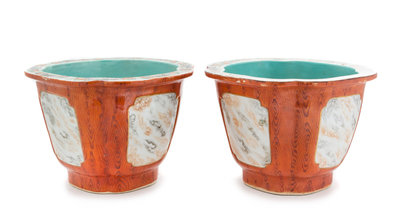 A Pair of Faux Bois Glazed Porcelain Jardinieres