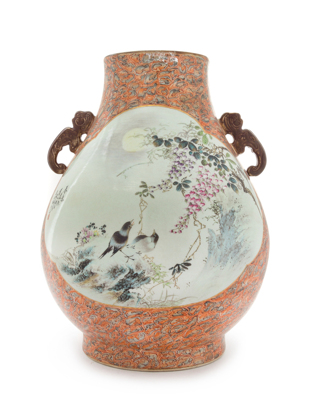 the baluster body raised on a short foot, painted with two large quatrefoil form panels enclosing birds and flowering branches, signed Cheng Yiting, alternating with smaller shaped reserves with further flowering plants, all set above a faux bois ground, flanked by a pair of brown glazed chilong handles, the underside bearing a three-character iron red seal mark.