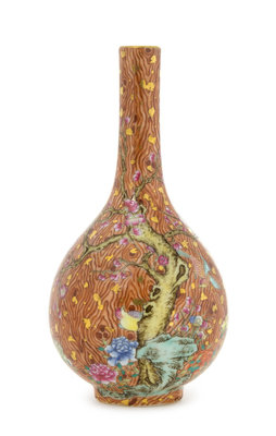 the globular body rising to a tall cylindrical neck and a gilt mouth rim, painted with blooming peonies and flowering prunus trees issuing from rockery besides birds in flight, all picked out on a faux bois ground decorated with splashes of gold, the underside bearing a Daoguang six-character mark in underglaze blue and likely of the period.