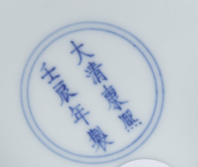 of circular form with flaring sides, painted to the interior with a central lotus blossom enclosed by beribboned Buddhist emblems, the exterior with similar decoration and a horizontal line of inscription reading jin rong tang shen shi ji qi, the underside bearing an apocryphal Kangxi eight-character mark in underglaze blue.