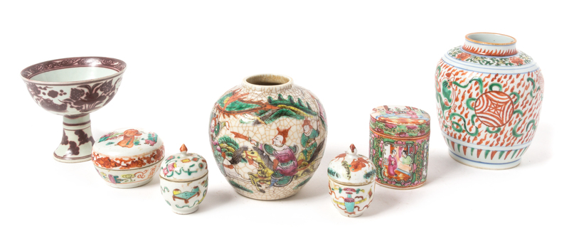 comprising an underglazed red stem cup painted with ducks and lotus flowers, a rose medallion covered jar with figures and floral scrolls, three famille rose covered jars painted with children and precious objects, two larger jars one painted in red and green showing fu lions chasing a brocade ball and one painted in polychrome enamel showing a battle scene.
