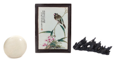 comprising a polychrome painted porcelain plaque set within a hardwood frame, a white glazed circular seal paste box and cover, a black glazed mountain-form brush rest.