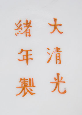 painted to the rounded exterior walls with four medallions enclosing characters wan shou wu jiang (boundless longevity) interspersed with flower heads and entwined leafy vines, the interior decorated with shou medallions, the underside bearing a Guangxu six-character iron red mark.