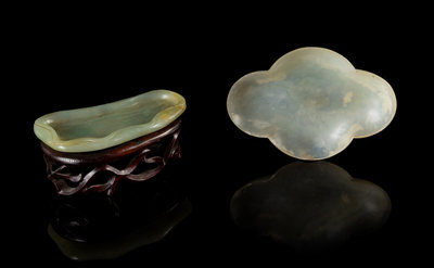 the first of a quatrefoil form, the second of a lotus leaf-form, raised on a fitted hardwood stand.