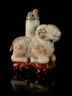 the creamy stone with brown and black streaks throughout, carved in the form of a recumbent ram kneeling with four legs tucked under, the head facing forward with well carved curled horns and wide eyes, the mouth open showing its teeth, the body decorated with archaistic designs, surmounted by a cylindrical vessel carved with ruyi clouds, topped with a circular cover with a ram form finial, raised on a fitted hardwood stand.