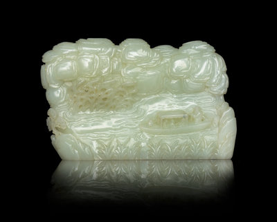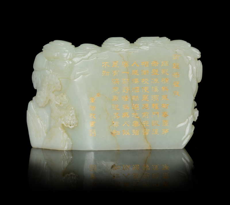 depicting a sampan on the water in a river with reeds on the high rocky banks, the reverse carved with a gilt highlighted imperial poem.