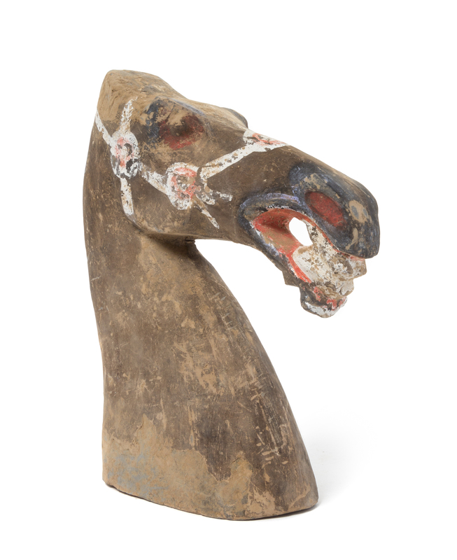 depicted with bared teeth and painted decoration depicting a bridle and delineating the eyes, pupils, nostrils, and mouth interior.