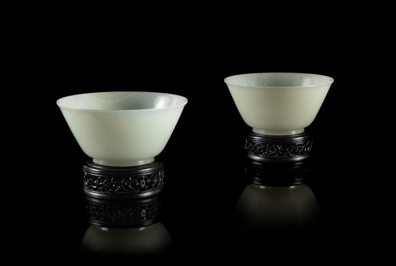 each of a well-polished semi-translucent stone with white mottling, finely carved with deep rounded walls rising from a short straight foot surmounted by a slightly everted mouth rim, raised on a fitted reticulated hardwood stand.