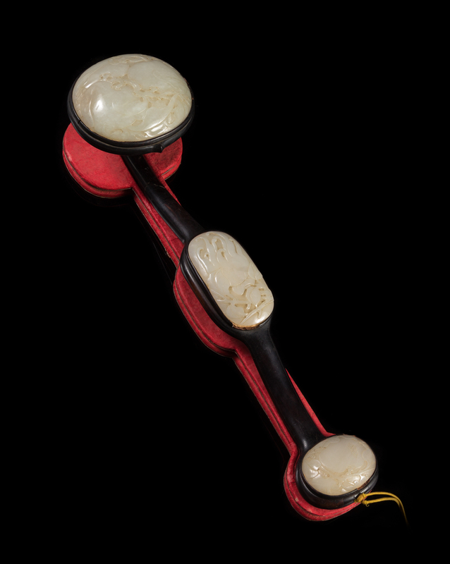 inset with three near-white jade plaques, the largest one carved in relief featuring a flying bat above two large peaches on a leafy branch, the second showing a Buddha's hand citron and the third one a pomegranate, the lower end of the handle pierced to hold a yellow silk core, having a red cloth covered stand.