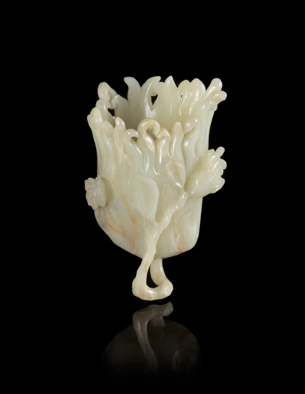 of a mottled white stone, naturalistically carved with curled finger-like tendrils and supported on a pierced gnarled stalk growing another smaller finger citrons and floral sprays.
