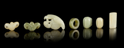 comprising two floriform beads, two pendants of bell-form, one ring-form pendant, one lock-form pendant, and one pendant in the form of a bird holding a lingzhi spray in its beak.