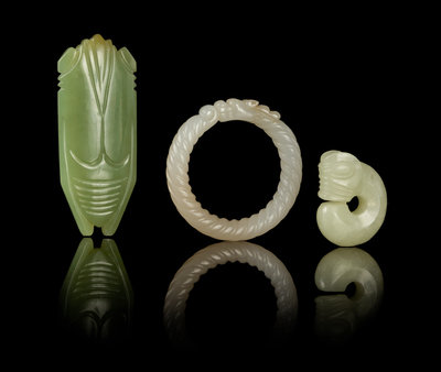 the first in the form of a cicada, the second in the form of twisted ring with a dragon head, the third in the form of a mythical beast.