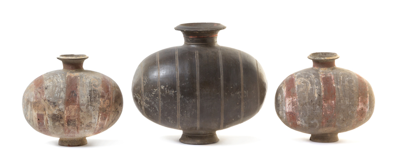each having a well-potted body raised on a short spreading foot, the first a black pottery example painted with white ribs, the other two grey pottery examples decorated with scroll works in polychrome.