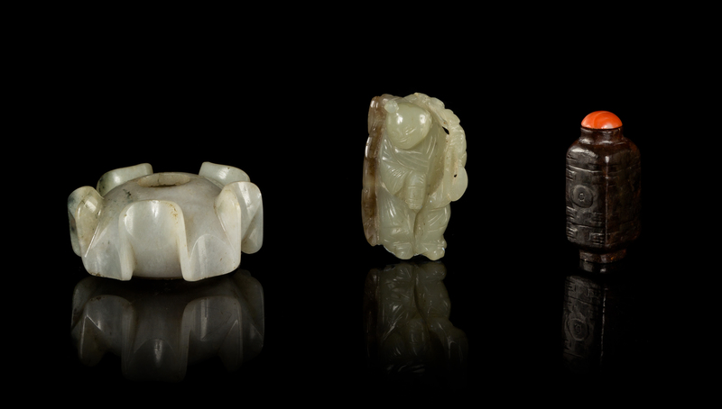 the first a cong - form snuff bottle, the second a carved toggle in the form of a child, the third a carved toggle.