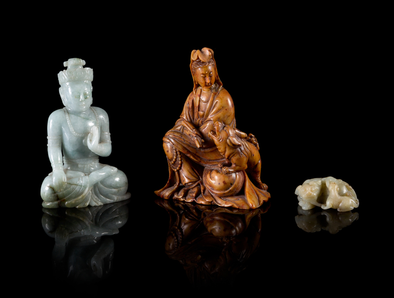the first a grey and celadon jade figural group of a crouching bixie and its cub; the second a green jadeite figure of a Buddhist deity; the third a soapstone figural group of a Guanyin seated beside a mythical beast.