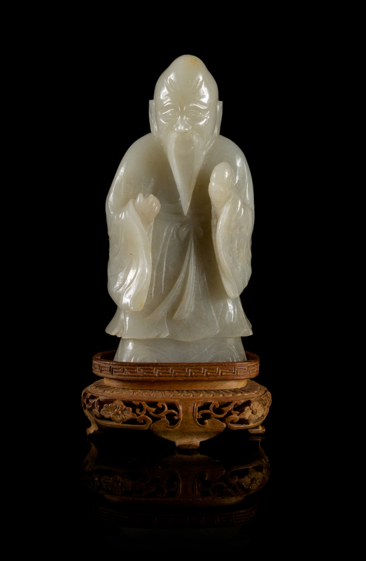 of an even colored translucent stone with white inclusions, the immortal of longevity depicted standing wearing flowing high-waisted garments, both hands raised with the left hand bearing a peach, the face carved with a gentle smile with finely combed long beard, raised on a fitted hardwood stand.