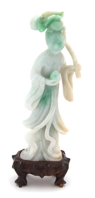 A Carved Apple Green and Celadon Jadeite Figure of Guanyin