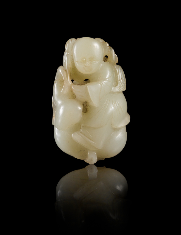 the figure depicted seated astride a lingzhi spray, the left hand gripping a gourd and the right a ruyi scepter.