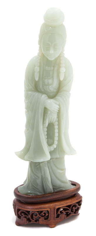 the deity depicted standing wearing draped robes, bearing a strand of prayer beads, all hair pulled to a high chignon, raised on a fitted hardwood stand.