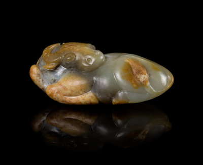 A Celadon and Russet Jade Figure of a Recumbent Buffalo