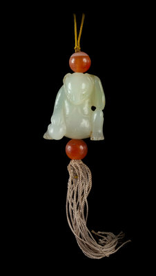 of an even colored stone, depicting a seated bear with the left hand raised and the right hand resting on the right knee.