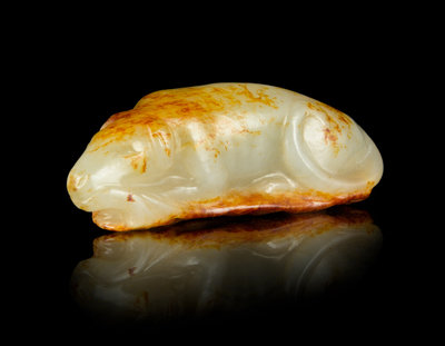 A Carved White and Russet Jade Figure of a Dog