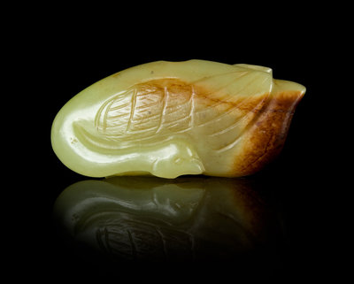 the even colored stone with russet skins, carved to show a recumbent duck with its head lowered and hidden underneath, having detailed feathers.