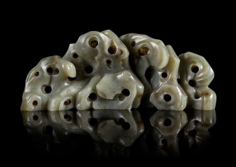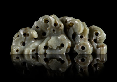 of a mottled grey stone with russet flecks, naturalistically pierced and carved in the form of a rocky mountain.