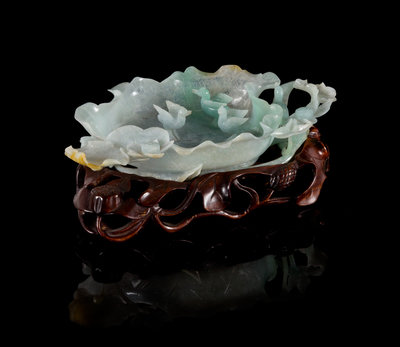 the translucent stone carved in the form of a large furled lotus leaf with three small ducks perched on top, the sides carved with lotus blossoms and branches with an additional duck rest atop, the underside having a network of stems, raised on a fitted reticulated hongmu stand also in the shape of a lotus leaf with a lotus flower, a lotus pod and a rice stalk to the sides.