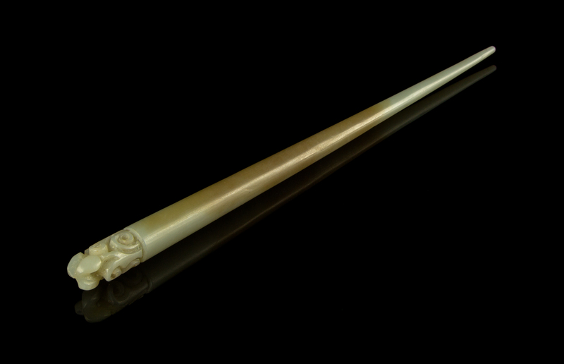 the stone of a celadon tone with a large russet patch, the slender tapering body capped with a finial pierced and carved with foliate scrolls.