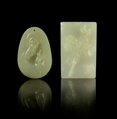 the first in a flattened egg-form, carved to depict a woman in profile, the second in rectangular form, depicting a dashing horse.