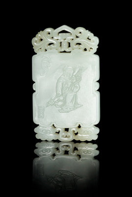 the main rectangular panel carved to one side showing a standing bearing a scepter and a weapon underneath a bat, the other side with lingzhi and scrolling plants, the upper register pierced and carved with foliate scrolls, the lower end showing ruyi clouds.