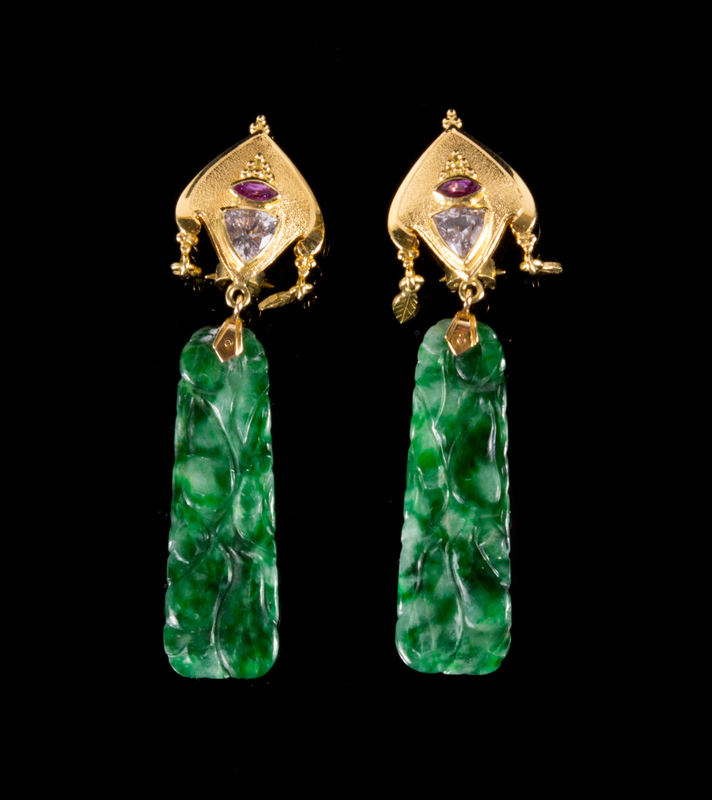 A Pair of Jadeite and Yellow Gold Mounted Ear Clips