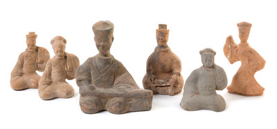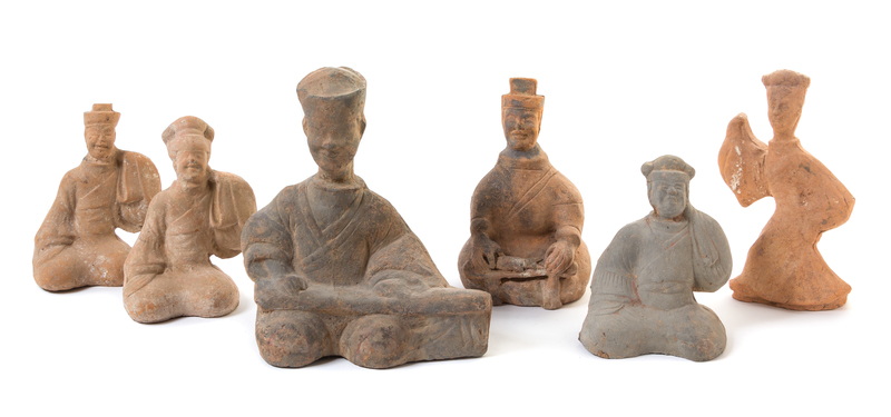 each dressed in draped robes, two playing musical instruments and four in dancing postures.