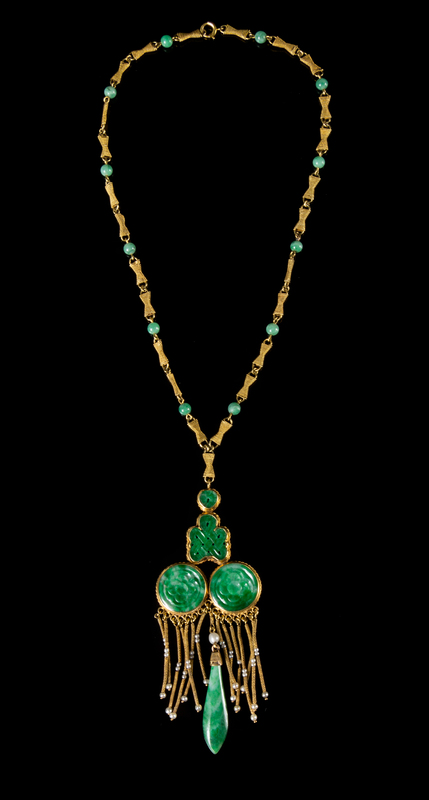 inset with four apple green and celadon jadeite plaques one in the shape of an endless knot, the other of floriform, suspending a teardrop shaped jadeite pendant, the gold necklace embellished with small jadeite beads and pearl seeds.