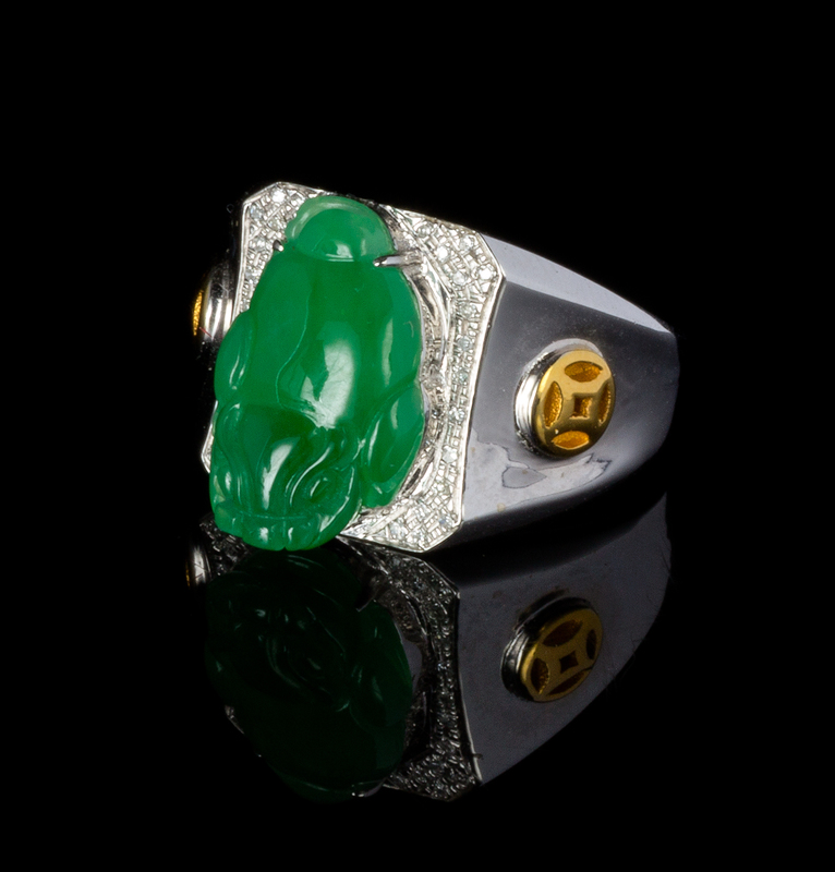 the even green stone carved in the form of a recumbent pixiu, each side set with coin decoration.