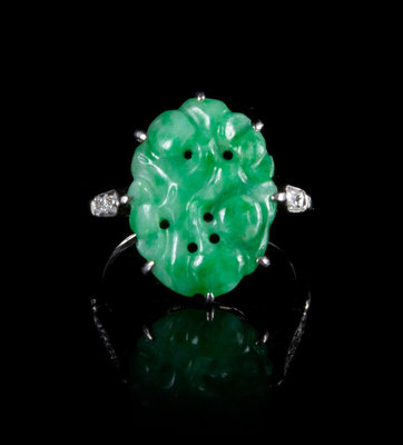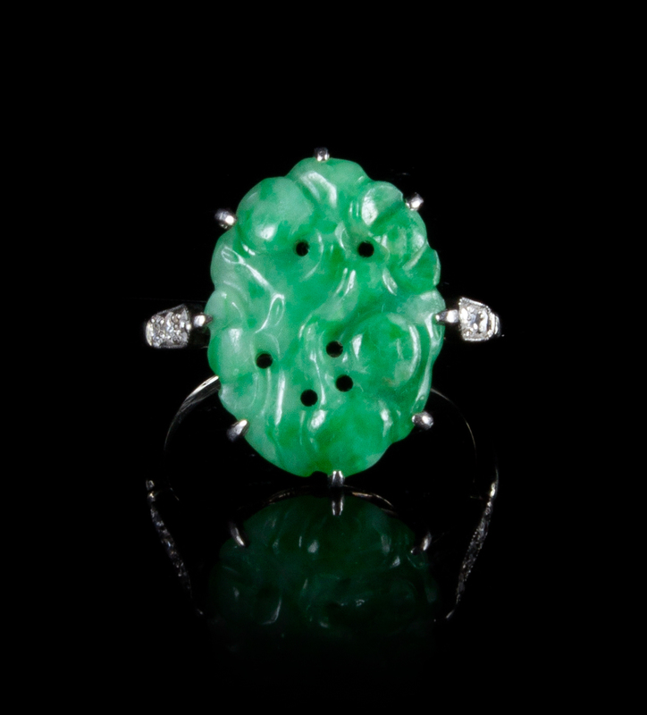 the apple green and celadon stone pierced and carved with floral scrolls.