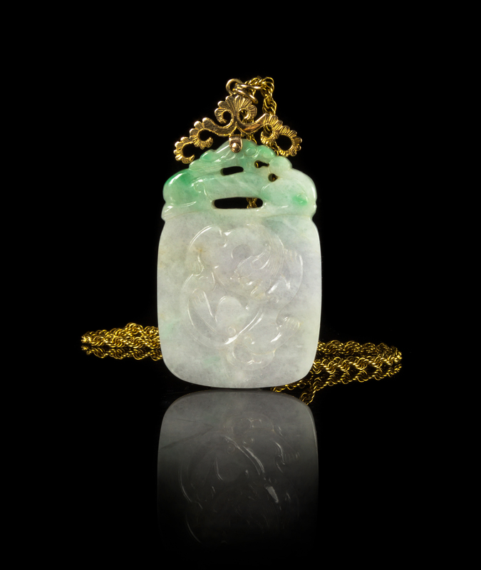 the mottled white stone with light apple green inclusions, of rounded rectangular form carved to both sides in relief showing chilong, suspended from a yellow gold chain.