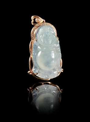 the icy translucent stone carved as a laughing Buddha set into a rose gold mounting inset with diamonds.