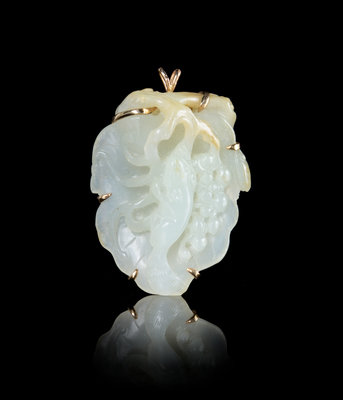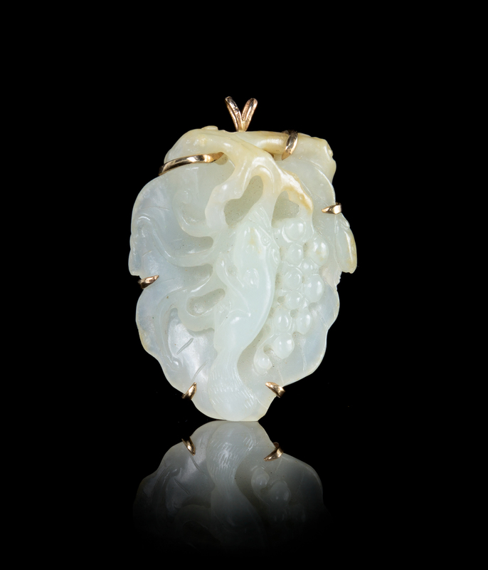 the leaf-form jade pendant of an even stone with light russet inclusions, carved to the front in relief depicting a squirrel and grapes, the reverse with branches.