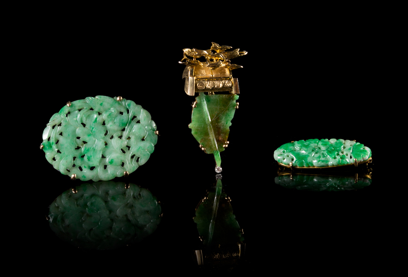 the first carved to depict a bird of paradise among flowering branches, the second carved to depicting flowering branches, the third carved to depict a windblown sail, set in a gold mounting depicting the rear of a ship among waves.