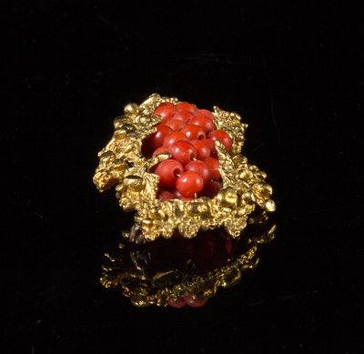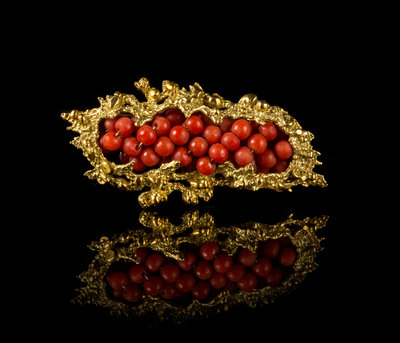 the center having rows of small coral beads, circled by an 18 karat gold mounting in the shape of foliate scrolls.
